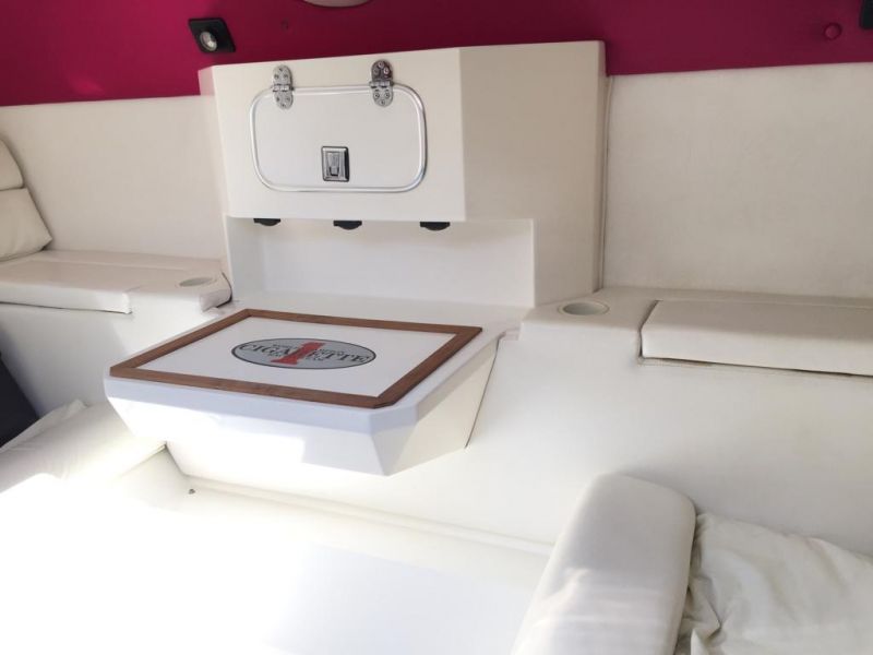 Cockpit : 2 Stehsitze ( Schalensitze ) aus Kunststoffleder weiß sowie 1 Rücksitzbank weiß mit Kunstlederbezug, Polsterliegefläche über Motorraum, Instrumententafel mit 20 Instrumenten für die Maschinenüberwachung, Schalter für Navigation, Tiefenmesser, Kompass, Geschwindigkeitsmesser, Trimmanzeige für Trimmklappen und Antriebe