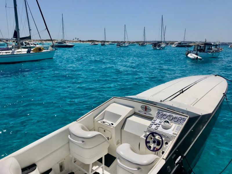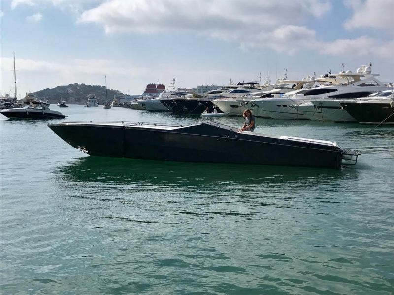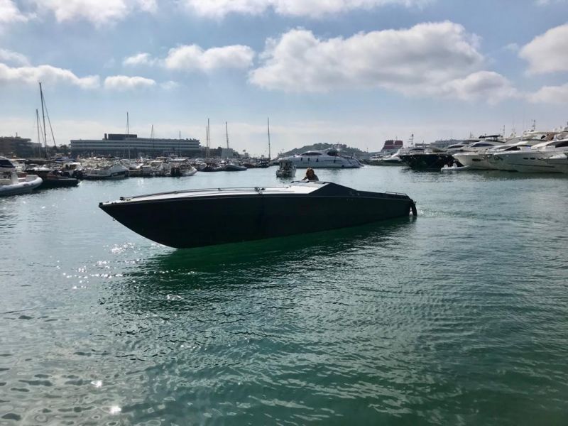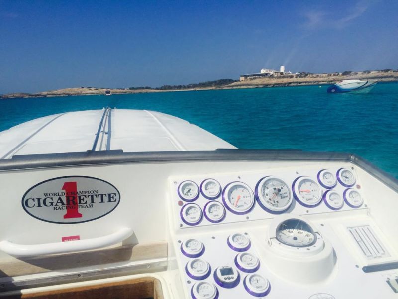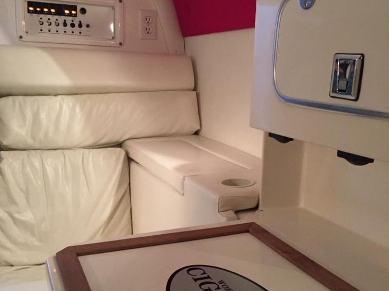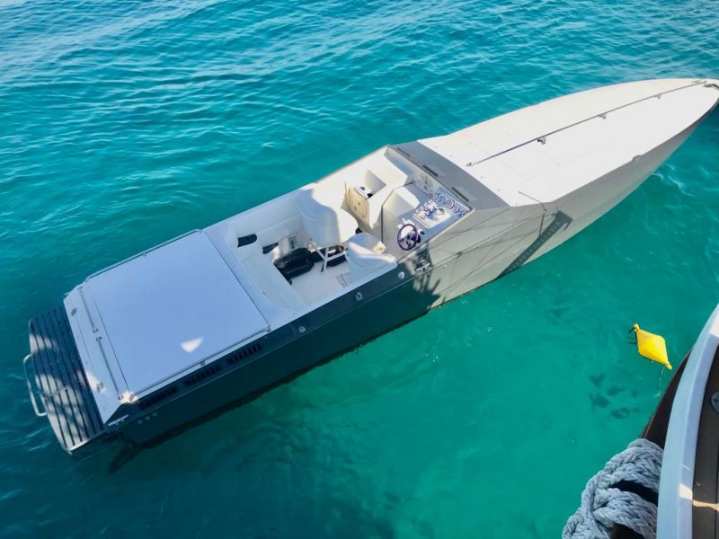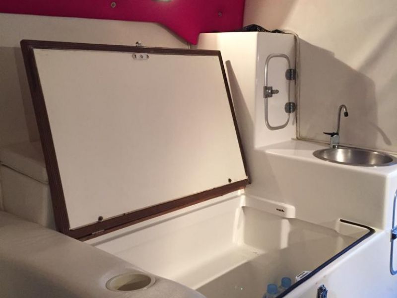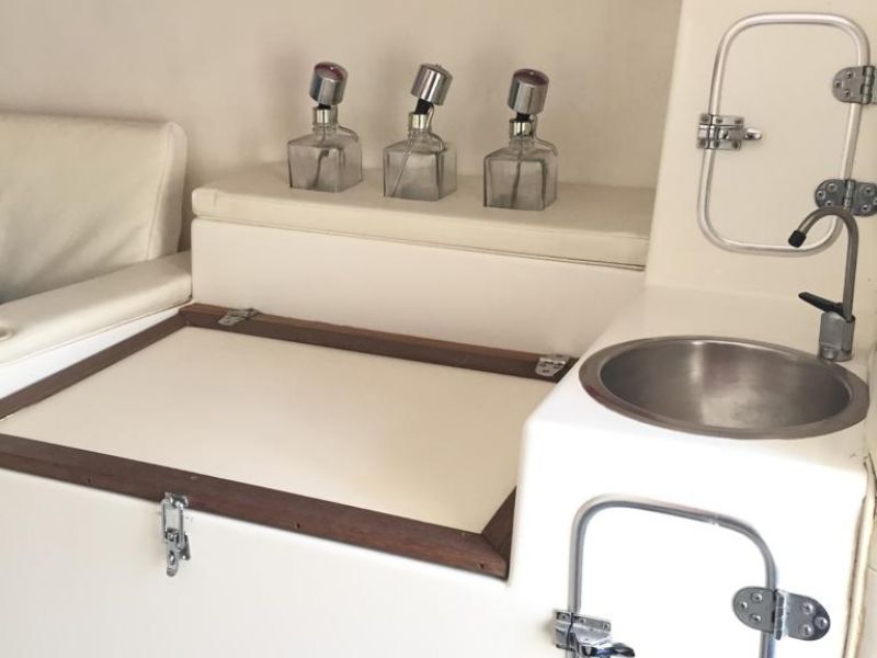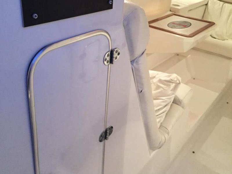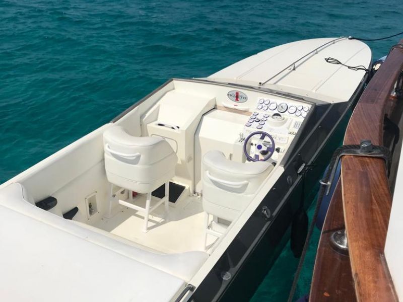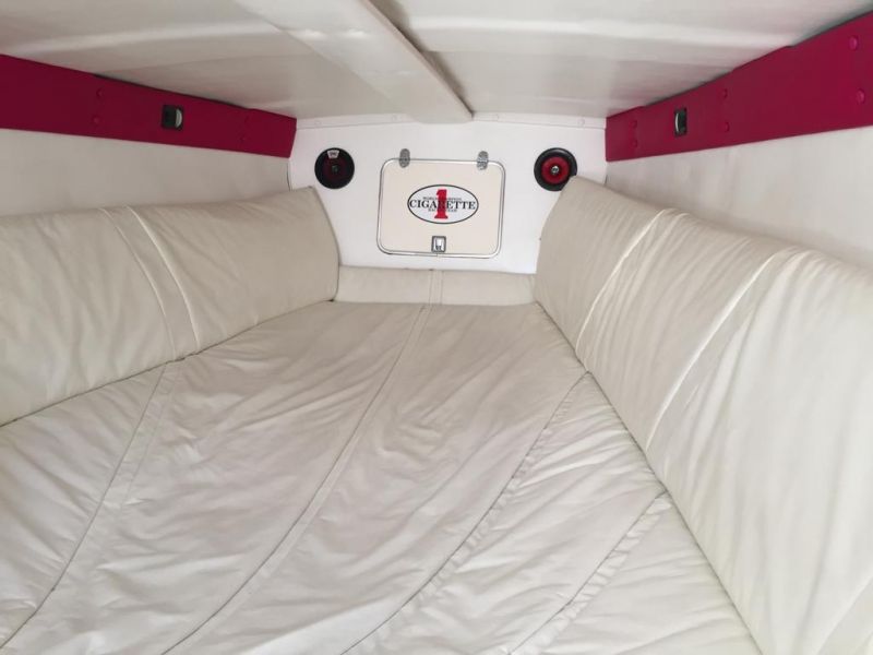 Cockpit : 2 Stehsitze ( Schalensitze ) aus Kunststoffleder weiß sowie 1 Rücksitzbank weiß mit Kunstlederbezug, Polsterliegefläche über Motorraum, Instrumententafel mit 20 Instrumenten für die Maschinenüberwachung, Schalter für Navigation, Tiefenmesser, Kompass, Geschwindigkeitsmesser, Trimmanzeige für Trimmklappen und Antriebe