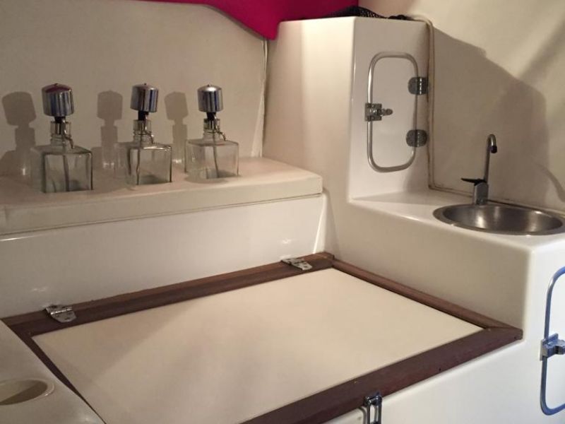 Bugkabine : mit V-förmiger Liegefläche mit Kunststoffpolsterbezug bb. 2 Polstersitze mit Tisch und Schrank, stb.-seitig 1 Eisbox mit Spüle und WC Zelle Teppichboden, Seitenverkleidung Kunstleder, eingebaute Beleuchtung, Radio und CD – Player