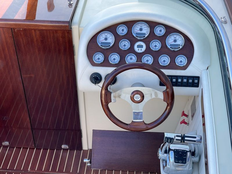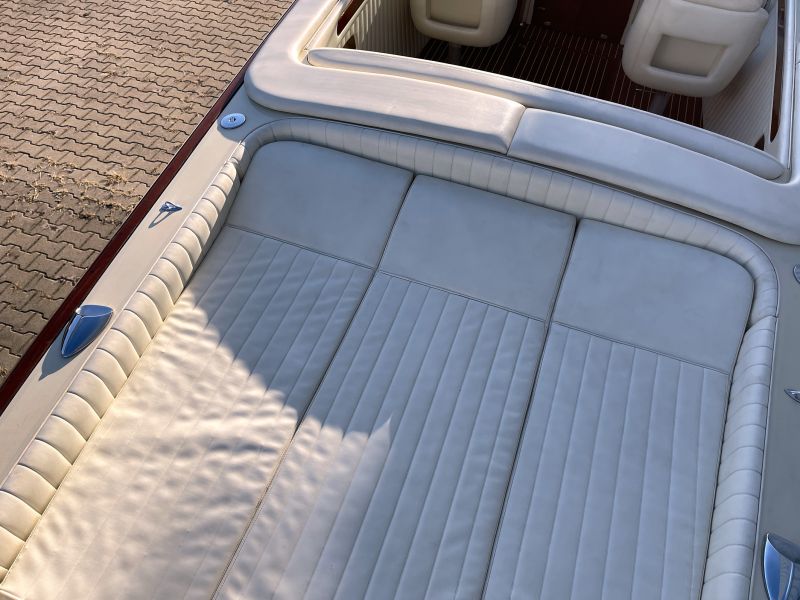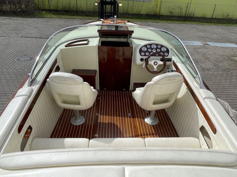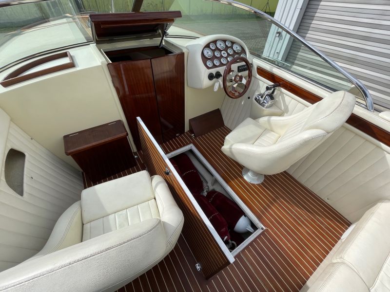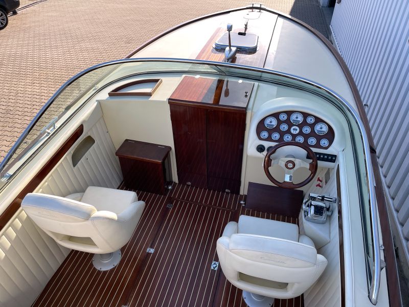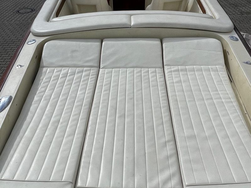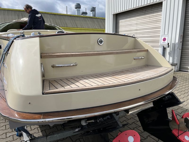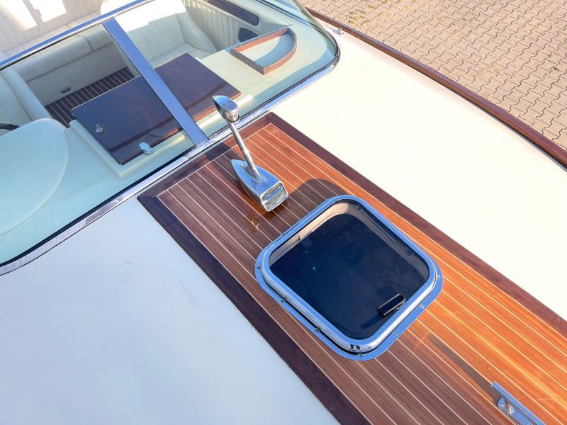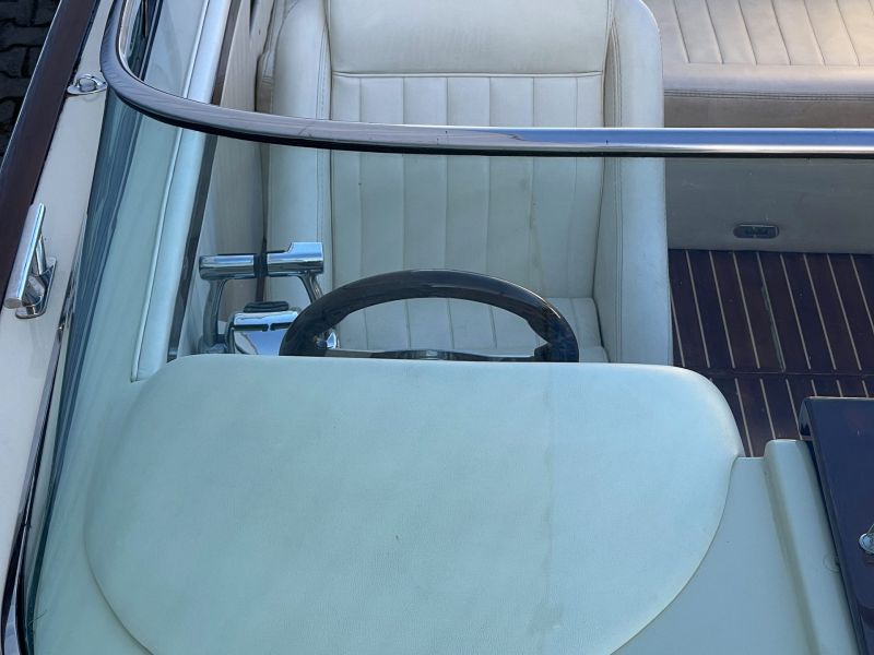 Dieses sehr schöne, cremefarbene Boot mit weißer Polsterung und klassischen Holzapplikationen ist ein echter Hingucker!