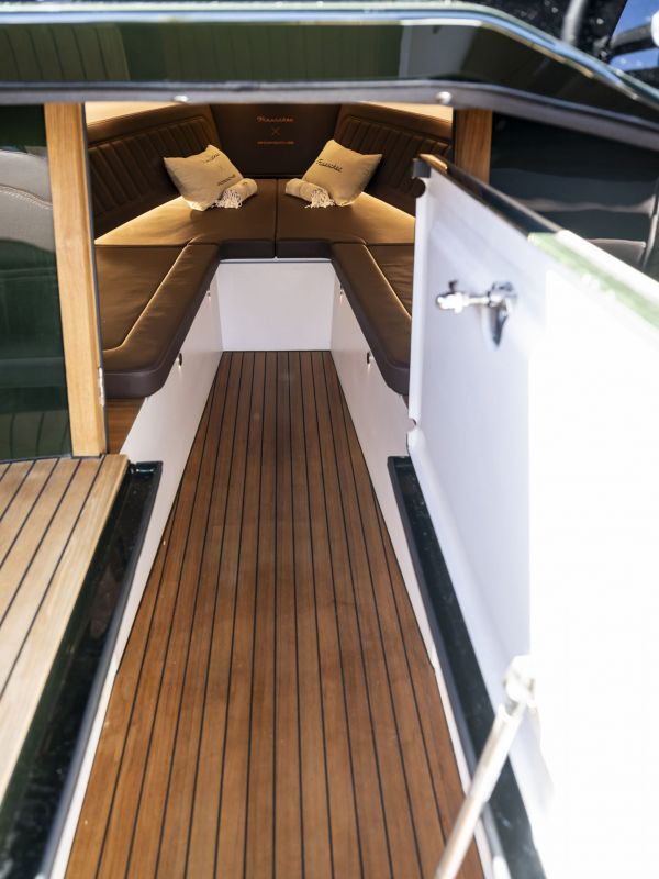 • Kajüte mit großzügige Polsterung, Seitenverkleidung, harmonische Beleuchtung, Ablagekasten, Teakboden