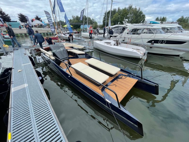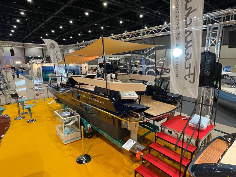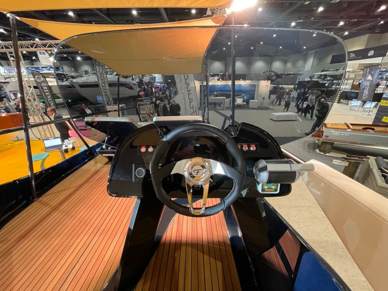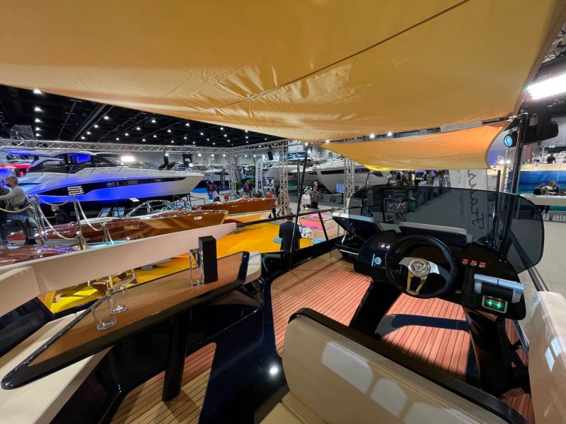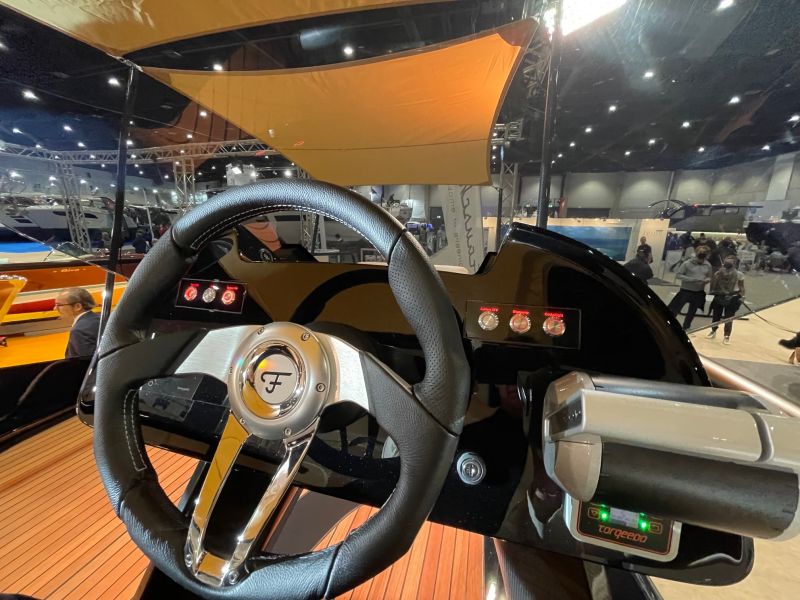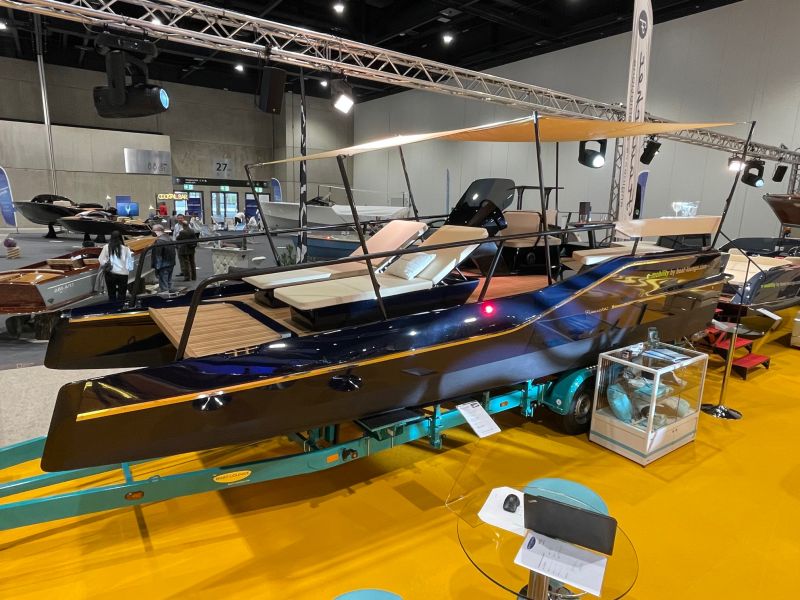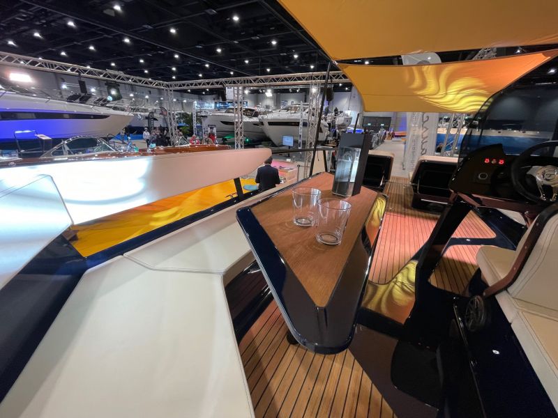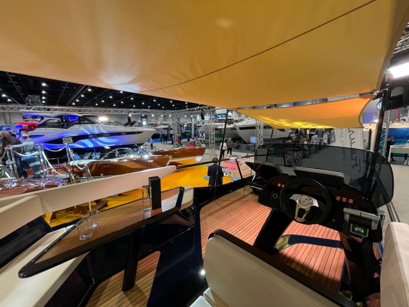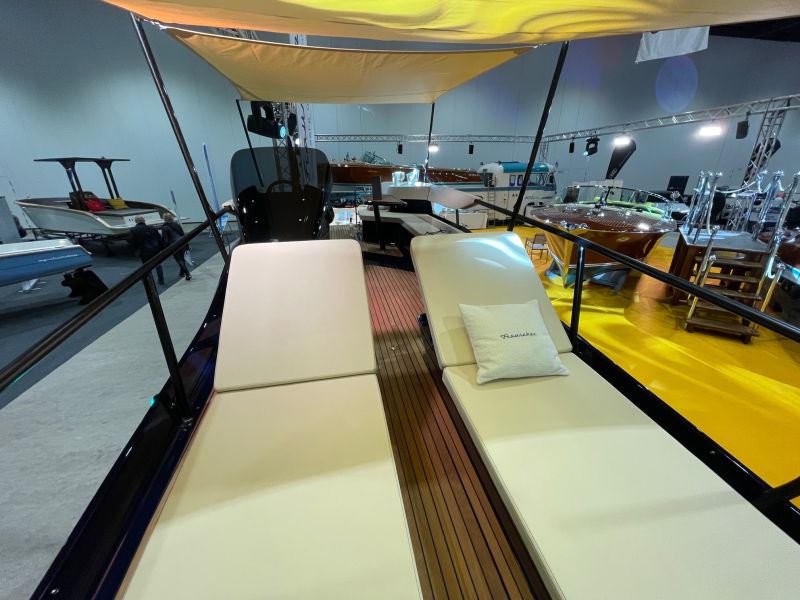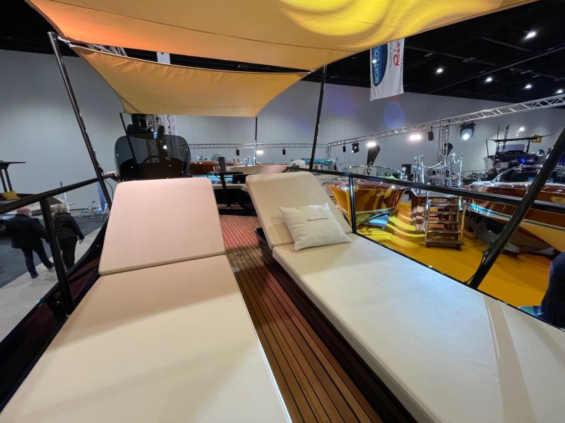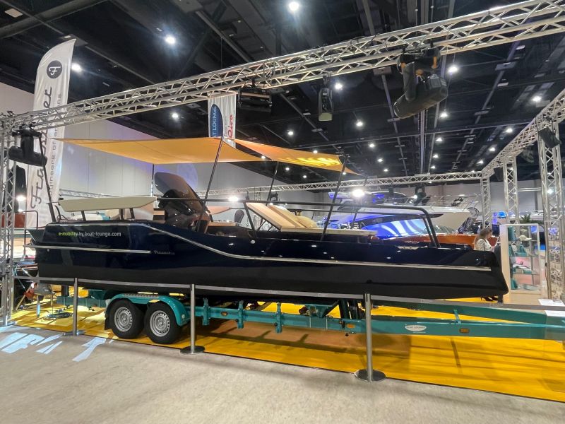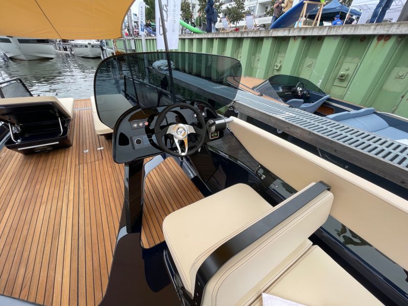 Das Frauscher TimeSquare 20 blau- im Showroom – Elektroboot mit futuristischem und markantem Design