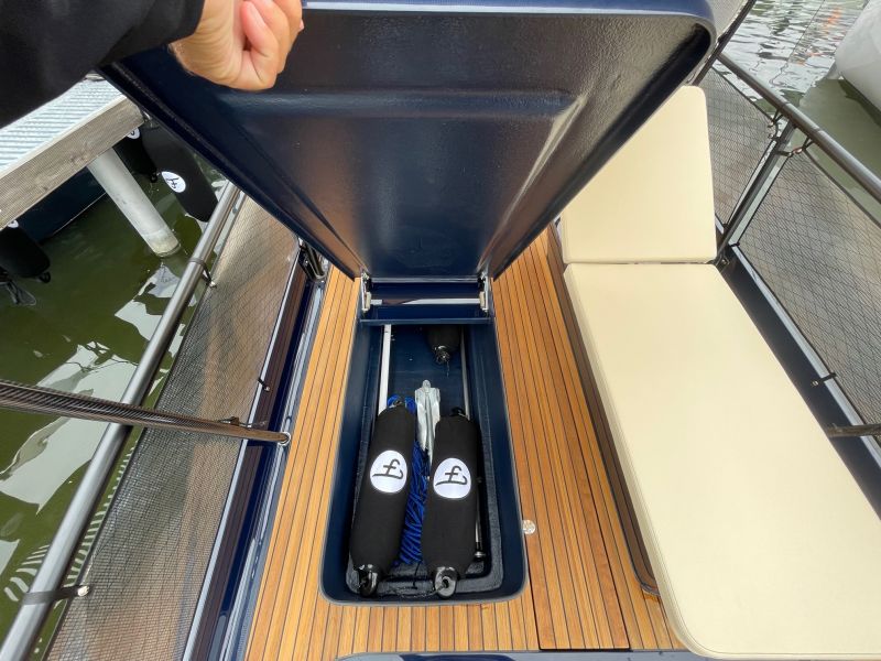 Der Rumpf des TimeSquares 20 ist in edlem dunkelbau gehalten, was sich harmonisch zum cremefarbenen Polster ergänzt. Dank ihrem innovativen Rumpfdesign erreicht die TimeSquare 20 Höchstgeschwindigkeiten und Reichweiten mit deutlich weniger Energieaufwand.