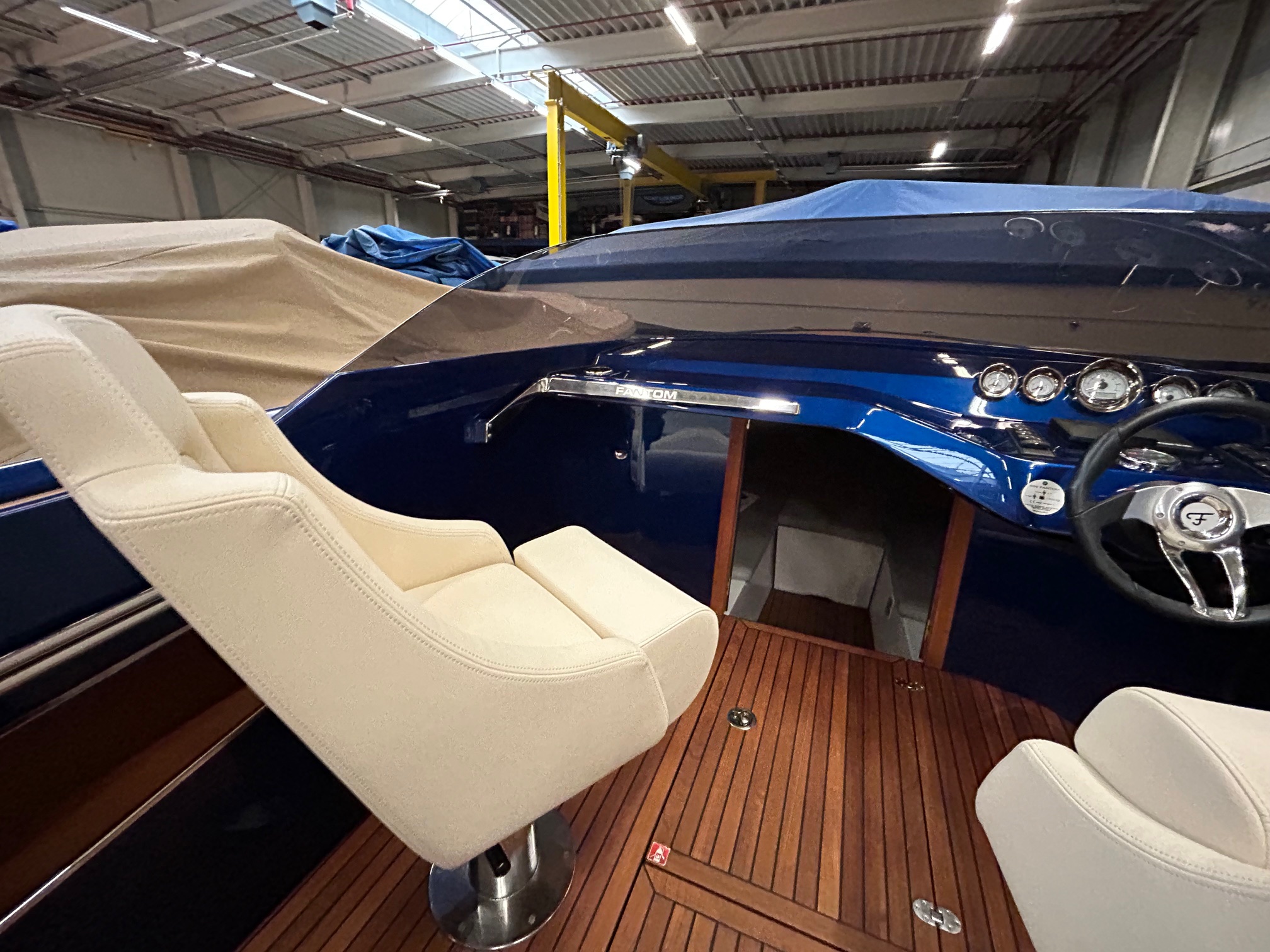 Diese vollausgestattete und in blau metallic lackierte Frauscher 858 Fantom ist ein erfrischender revolutionärer 8,6 Meter langer und trailerbarer Day Cruiser mit bestechendem Design. Die Frauscher Formsprache hebt sich wohltuend von Booten dieser Klasse ab und bringt die Individualität des Bootseigners zum Ausdruck.