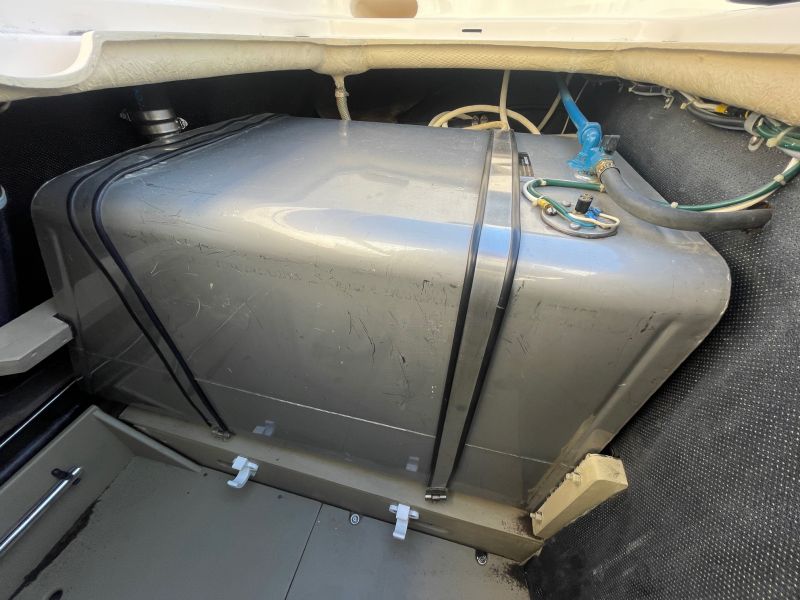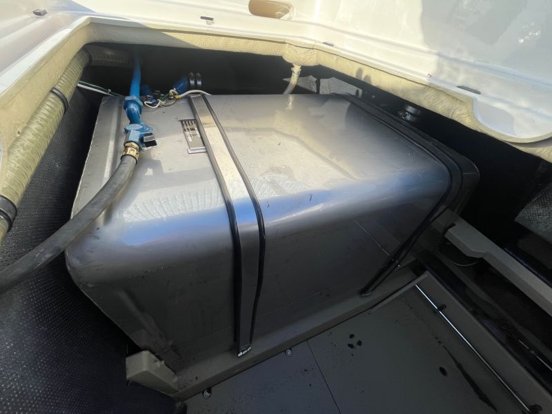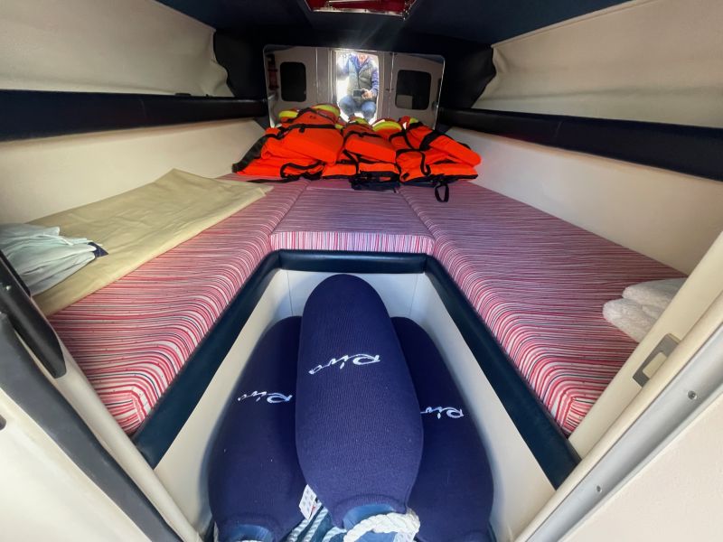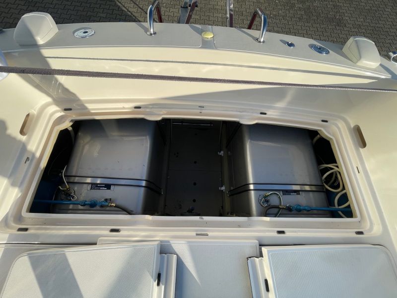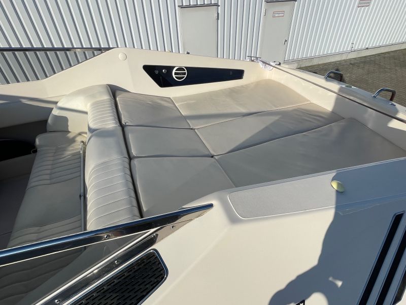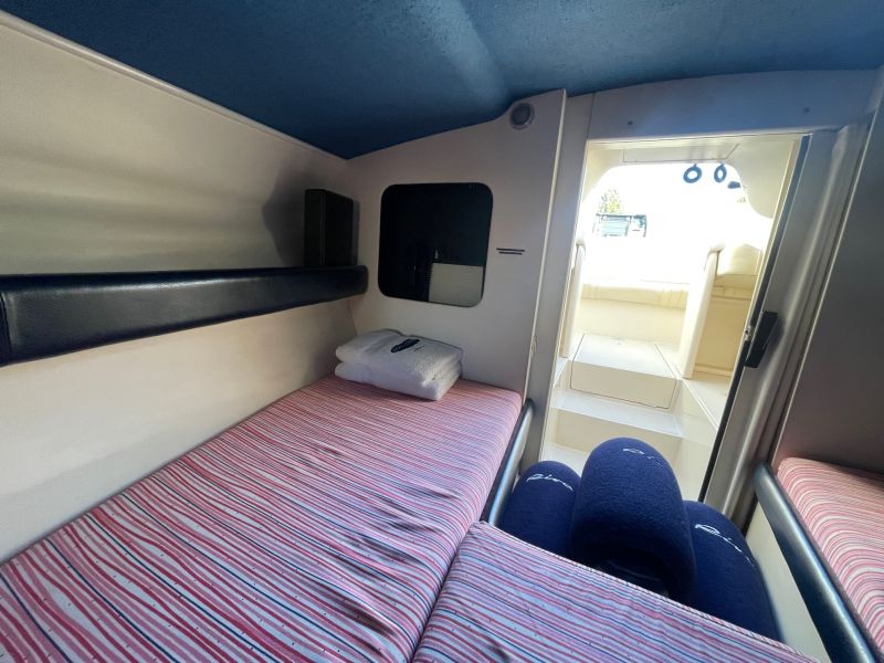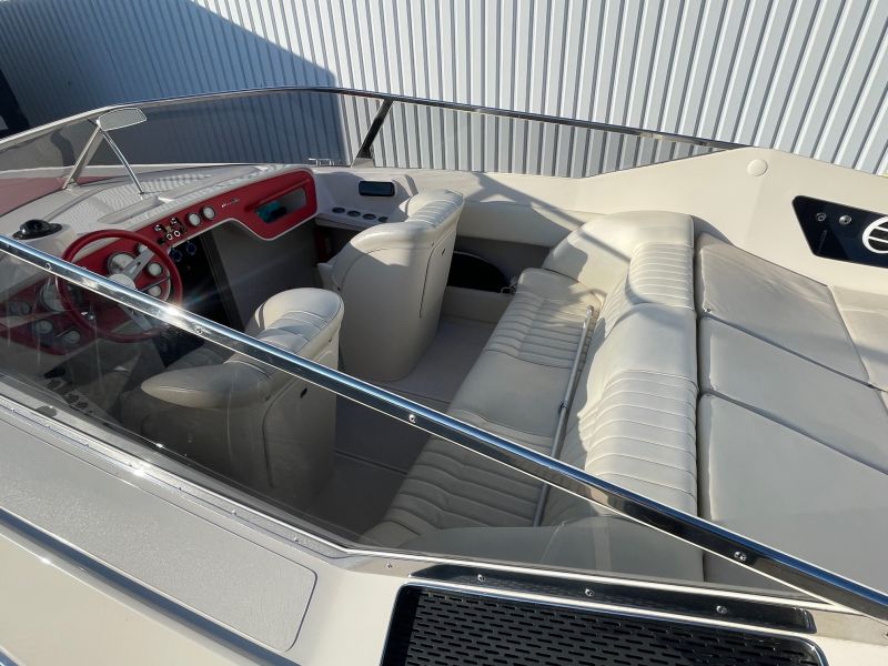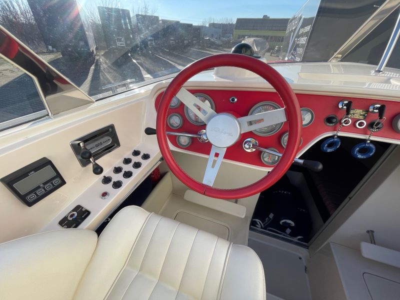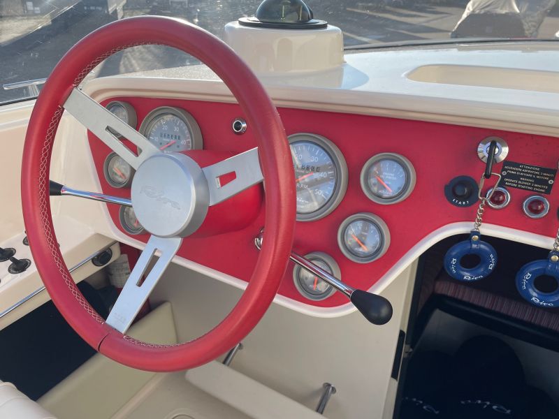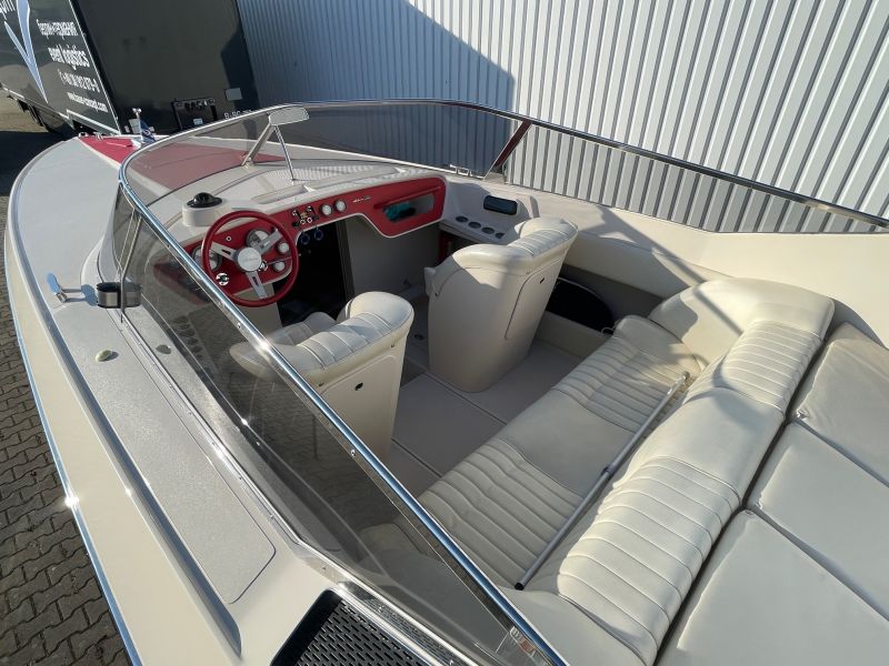 Der großzügige, sehr bequeme Sonnenbereich lädt zum gemütlichen Verweilen auch mit mehreren Personen ein. Die Innenkabine ist mit zwei Schlafplätzen ausgestattet. Die sehr seltene rote / cremefarbene Lackierung ist in einem sehr guten Zustand und erinnert an die zeitweilige Kooperation von Riva mit einem großen italienischen Sportwagenhersteller…